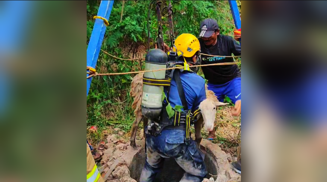 Petugas Pemadam Kebakaran dan Penyelamatan (Damkarmat) Kabupaten Bojonegoro kembali disibukkan evakuasi hewan. Kini, petugas Damkar Bojonegoro menyelamatkan 4 ekor kambing yang tercebur sumur, Rabu (11/9/2024).